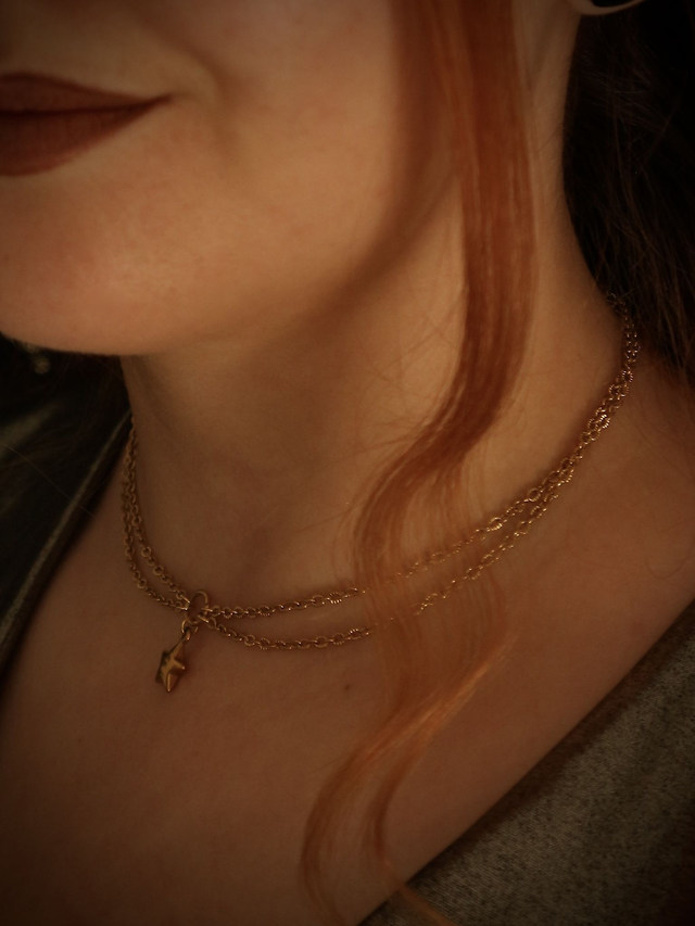 Un collier plus travaillé, avec deux chaînes qui se rejoignent en un pendentif étoile.